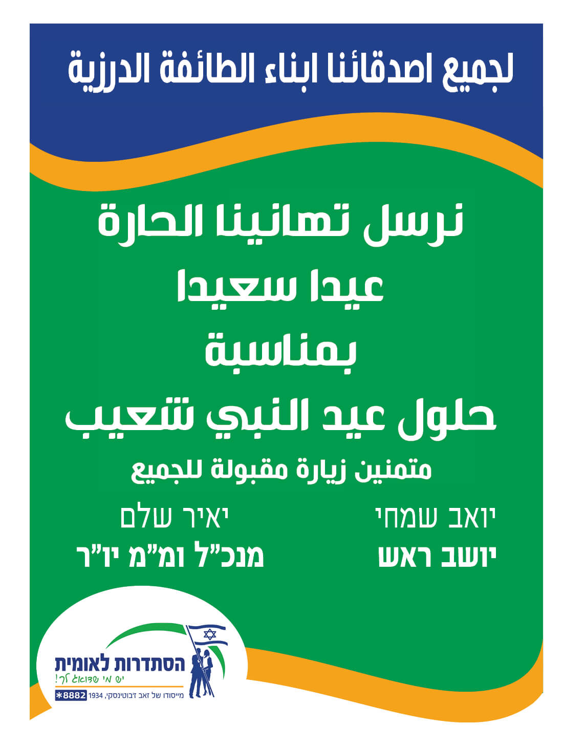 לכל חברינו בני העדה הדרוזית חג הנביא שועייב שמח [25.04.2017, 10:00] הסתדרות לאומית מאחלת לכל חבריה בני העדה הדרוזית, חג שמח לרגל חג הנביא שועייב.